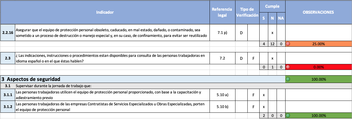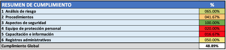 Al final del documento se resume en una tabla el porcentaje de cumplimiento de cada aspecto auditable de la NOM
