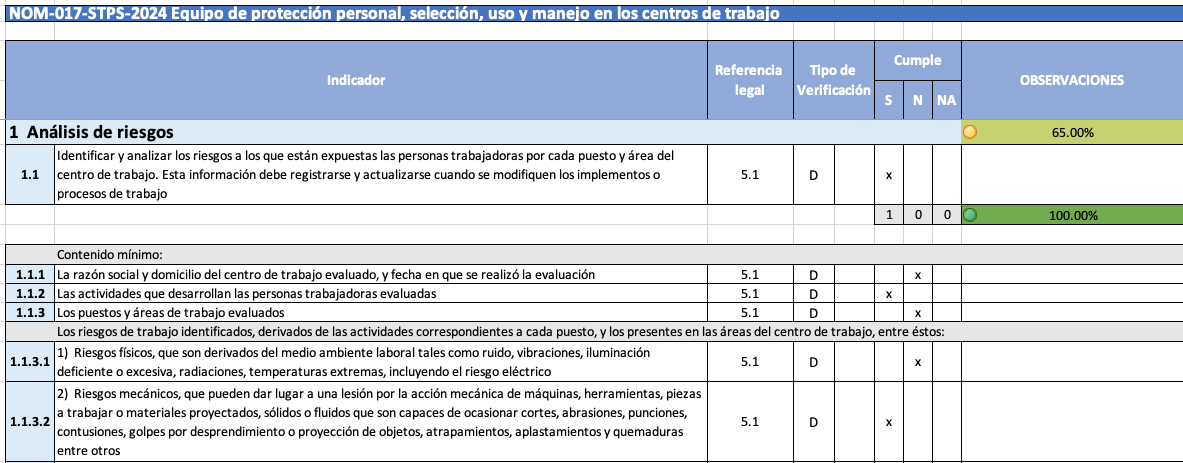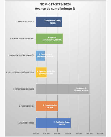 Herramienta en Excel para evaluar el cumplimiento de la NOM-017-STPS-2024, incluye una tabla resumen y un gráfico para visualizar el cumplimiento en porcentaje.